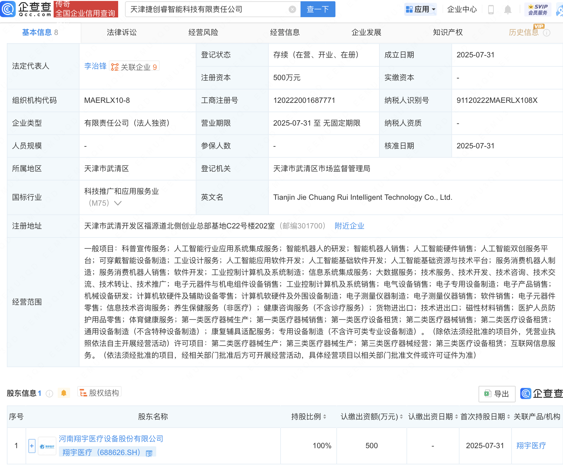 企查查APP显示,近日,天津捷创睿智能科技有限责任公司成立,法定代表人为李治锋,经营范围包含:人工智能行业应用系统集成服务;智能机器人的研发;智能机器人销售;人工智能硬件销售;人工智能双创服务平台等。企查查股权穿透显示,该公司由翔宇医疗(688626)全资持股。