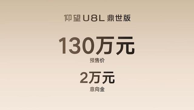 仰望汽车旗下全尺寸行政豪华SUV仰望U8L鼎世版全球预售发布会7月31日开启,预售价130万元,预订意向金2万元。作为仰望汽车的全新力作,仰望U8L鼎世版搭载易四方、云辇-P两大核心技术,秉承“鼎立天地”的东方设计哲学,以中式“鼎级审美”和细致入微的感官体验,将新能源时代的行政级豪华出行体验推向全新高度。此外,权益周期内限时支付意向金可享30,000元选配基金,仰望车主增换购可限时享至高价值80,000元增换购权益。