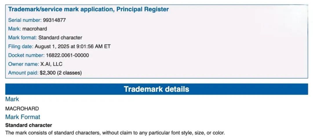 据美国专利商标局公开信息显示,马斯克旗下人工智能公司xAI于2025年8月1日正式提交“Macrohard”商标注册申请(序列号99314877),申请费用为2300美元(约合人民币16569元),涵盖两个核心商标类别。