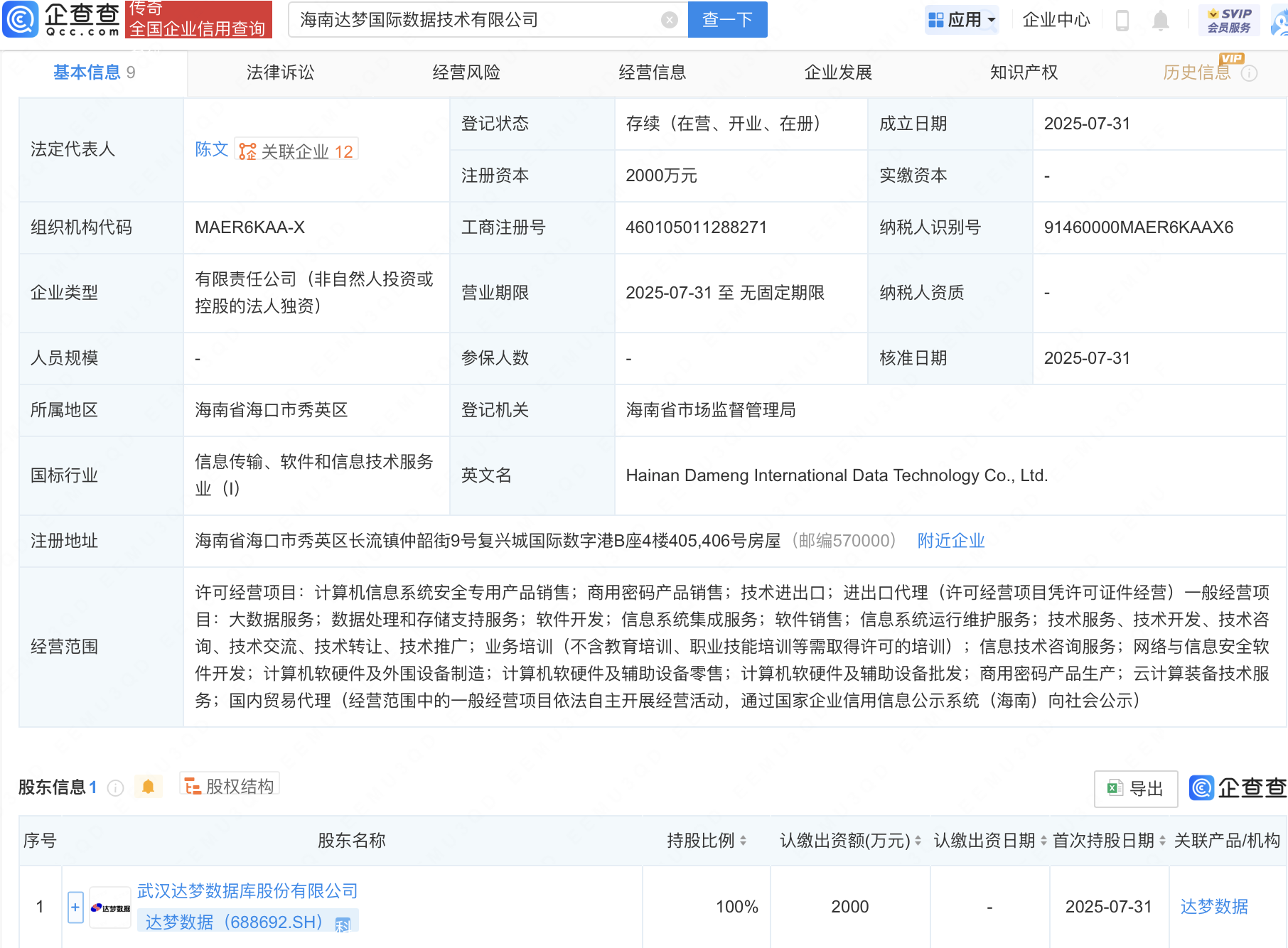 企查查APP显示,近日,海南达梦国际数据技术有限公司成立,注册资本2000万元,经营范围包含:信息技术咨询服务;网络与信息安全软件开发;计算机软硬件及外围设备制造等。企查查股权穿透显示,该公司由达梦数据(688692)全资持股。