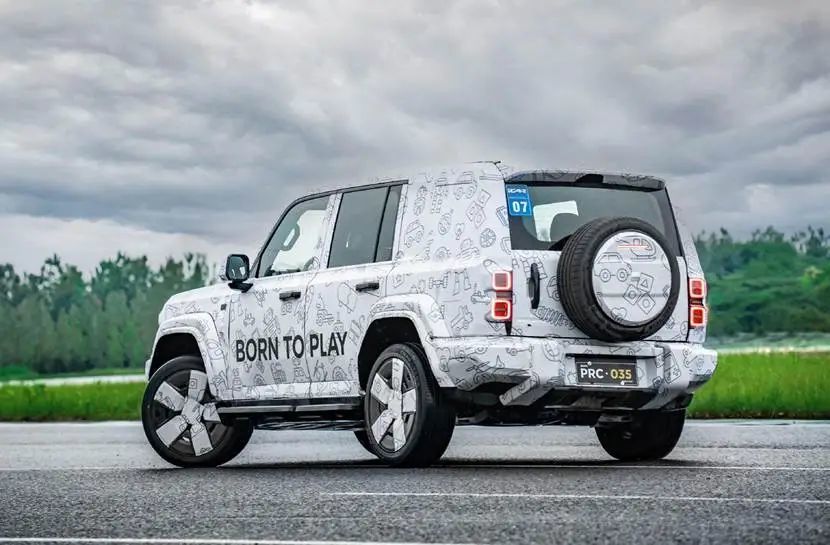 车尾部分,iCAR V27依旧神似卫士的尾灯造型。新车不仅配备了侧开式尾门、尾翼、外挂式备胎,还有竞技风格后保险杠。