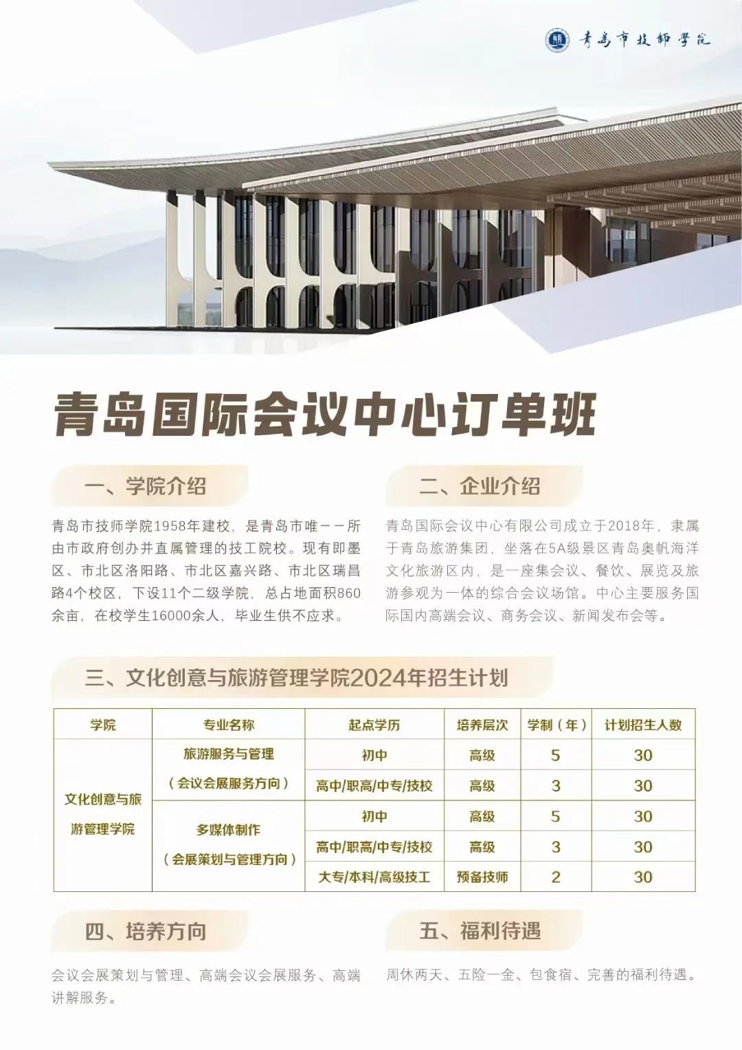 他报读的多媒体制作专业,又叫作“青岛国际会议中心订单班”,宣传页上,一边是学校的介绍,一边是对青岛国际会议中心的介绍。