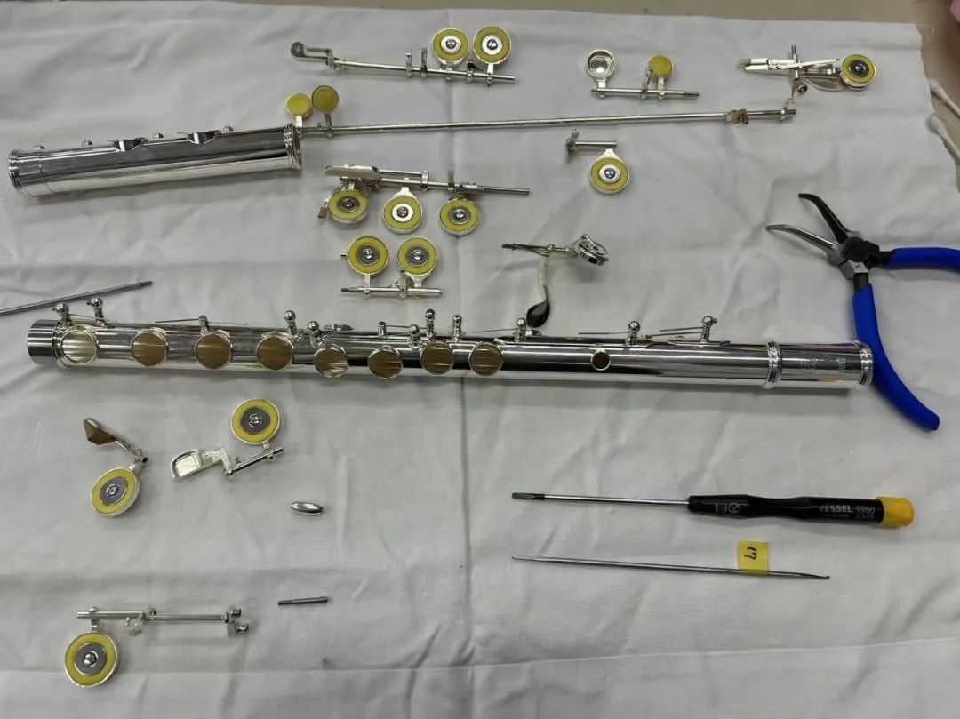 课上,老师会让每个人上手修理乐器,把乐器拆开、清洁,找到坏掉的原因,用各种专业的工具调试。