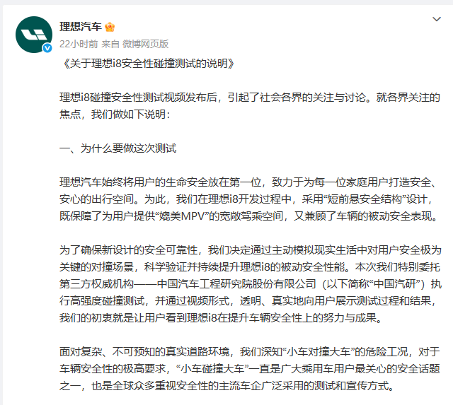 理想汽车发布《关于理想 i8 安全性碰撞测试的说明》,就各界关注的焦点作出说明。