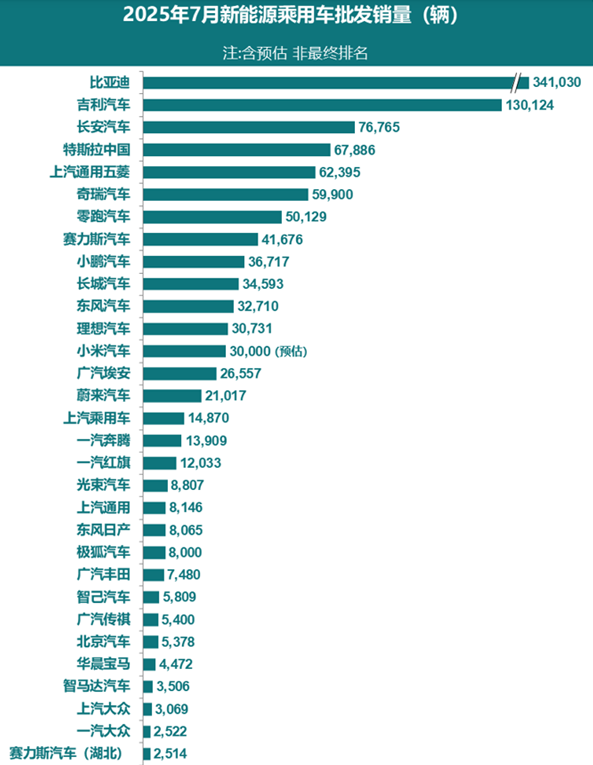 乘联分会 2025 年 7 月新能源乘用车批发销量榜单新鲜出炉。