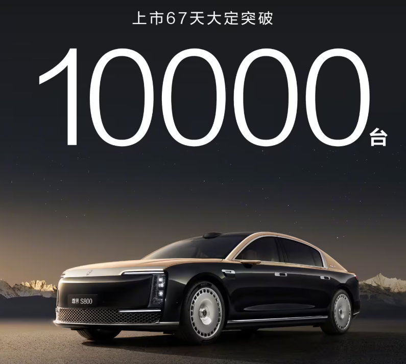 华为常务董事、终端 BG 董事长余承东上午宣布,尊界 S800 上市 67 天大定突破 10000 台。