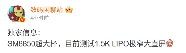 博主 @数码闲聊站 在微博透露了某厂 SM8850 超大杯机型的进展。