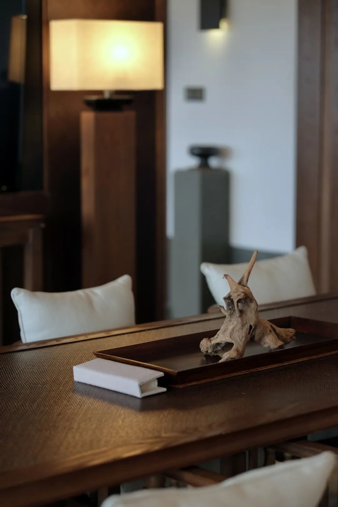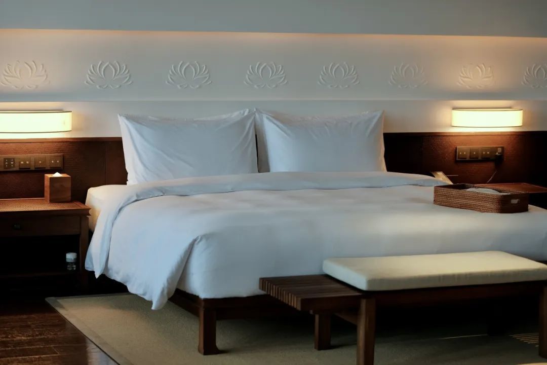 步入大堂,前台已然“隐退幕后”。从公共区域到私密客房,莲花元素贯穿始终,禅思沁入肌理。连廊外山水相接,飞鸟低徊;闲坐于此,可弈棋,亦可对着窗外的水墨长卷发呆。落座片刻,工作人员悄然点燃一炷线香,在袅袅烟雾升腾间,入住手续便已办理完成。
