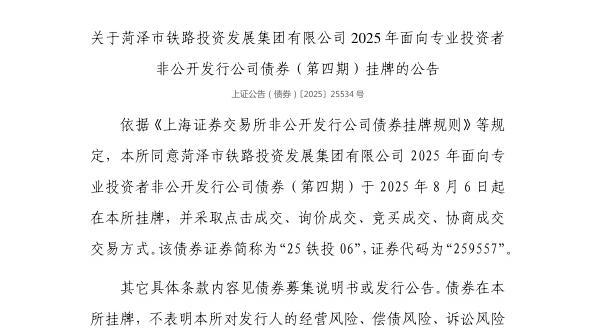 8月5日,上交所发布关于菏泽市铁路投资发展集团有限公司2025年面向专业投资者非公开发行公司债券(第四期)挂牌的公告。