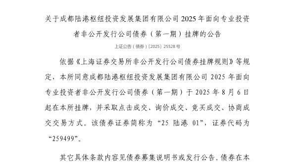 8月5日,上交所发布关于成都陆港枢纽投资发展集团有限公司2025年面向专业投资者非公开发行公司债券(第一期)挂牌的公告。