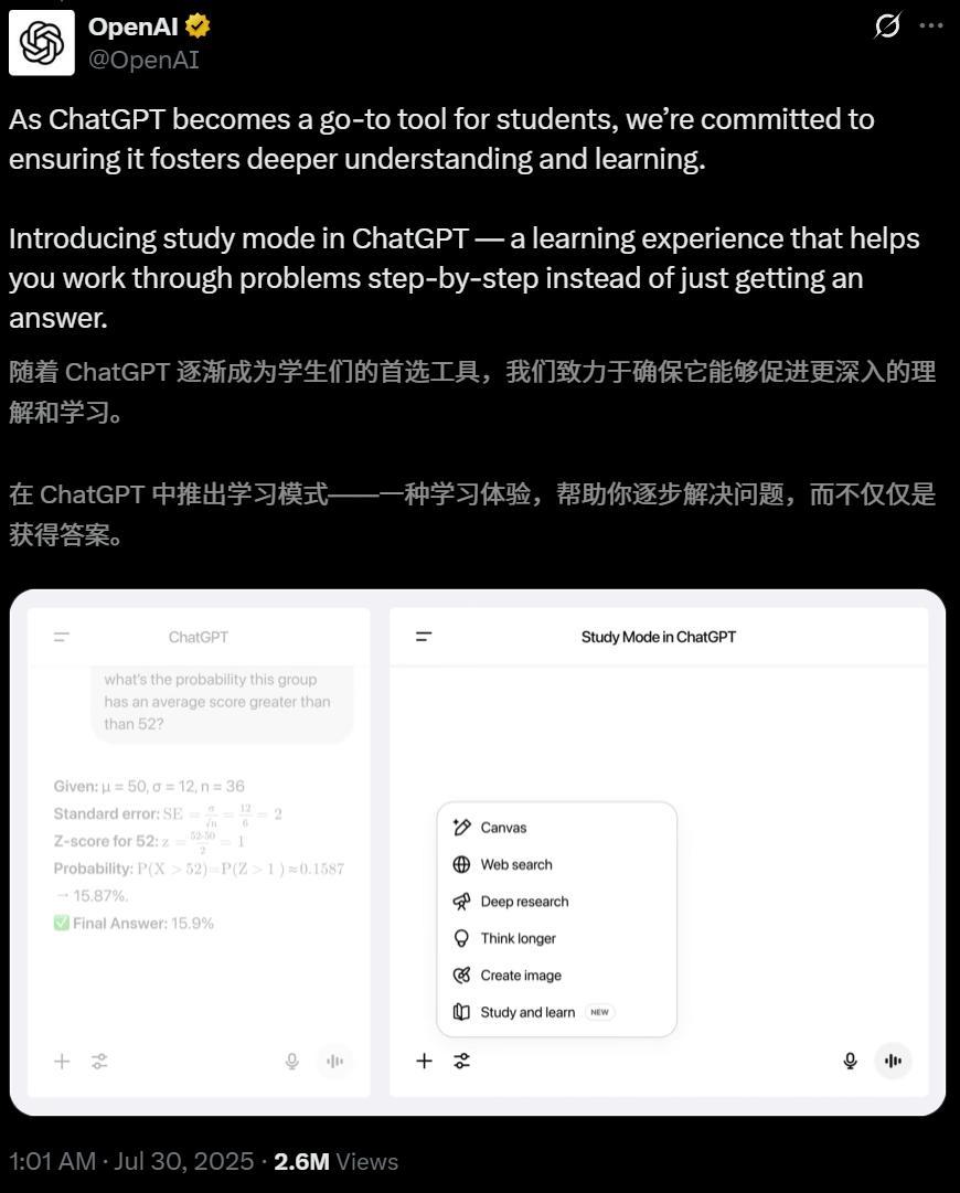 结合此前刚刚发布不久的「ChatGPT学习模式」,正应了OpenAI自己的宣言: