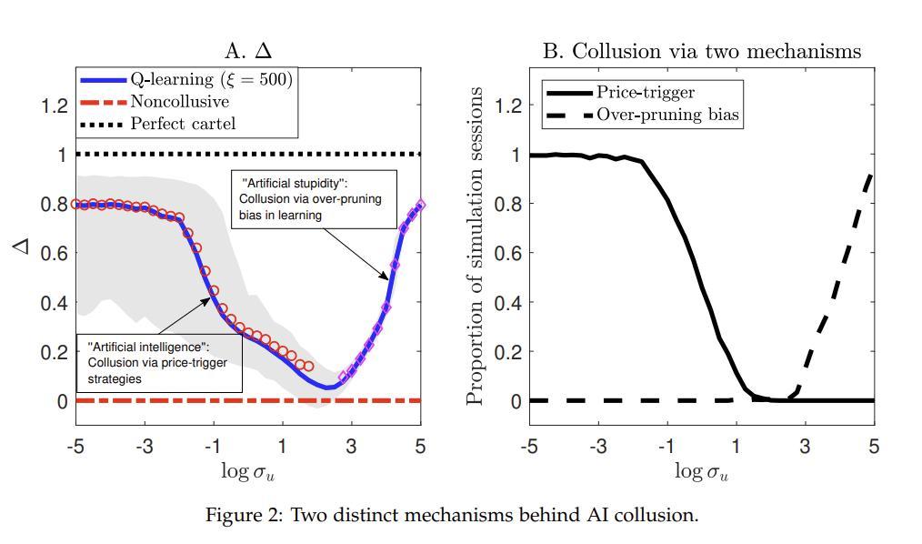 图注:AI在低噪声时通过价格触发策略合谋(人工智能),高噪声时因学习偏差导致非理性合谋(人工愚蠢),合谋机制随噪声水平变化。
