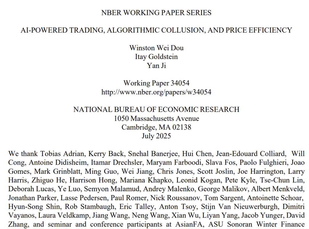 一项由美国国家经济研究局(NBER)发布的研究报告指出,人工智能驱动的交易算法能够在金融市场中独立发展出类似卡特尔的行为。