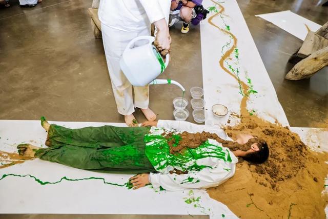 开幕现场,艺术家李思遥与孙铭池共创的表演《日·寸》通过“人、土、水”的意象,勾勒出西北的生存逻辑。这三者不仅构成了自然生境的基本单元,也是构成人类文化经验的三位一体——人是行动者,土是记忆的承载,绿色的颜料则是连接与流动的象征。这种从土地出发的表达方式,正体现了银川当代美术馆一贯坚持的“深度在地化”艺术路径。