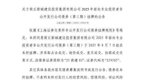 8月6日,上交所发布关于商丘新城建设投资集团有限公司2025年面向专业投资者非公开发行公司债券(第三期)挂牌的公告。