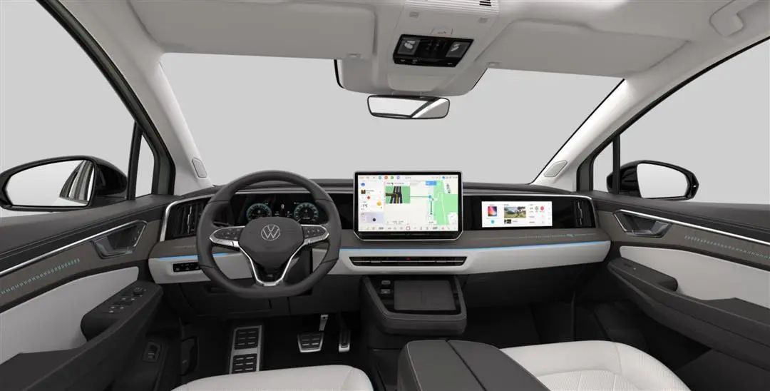 车内风格上更加“新能源化”,中控台物理按键非常少,用上了大众家族最新的设计,主驾、中控、副驾三屏组成,车机大屏尺寸更大,用上了怀挡,加入了两组手机无线充电面板。车机较现款有所升级,导航、语音和娱乐功能体验会更好。车机系统搭载了高通8155芯片,语音助手与科大讯飞合作。配置上有30色氛围灯、哈曼卡顿音响、座椅通风加热按摩等。
