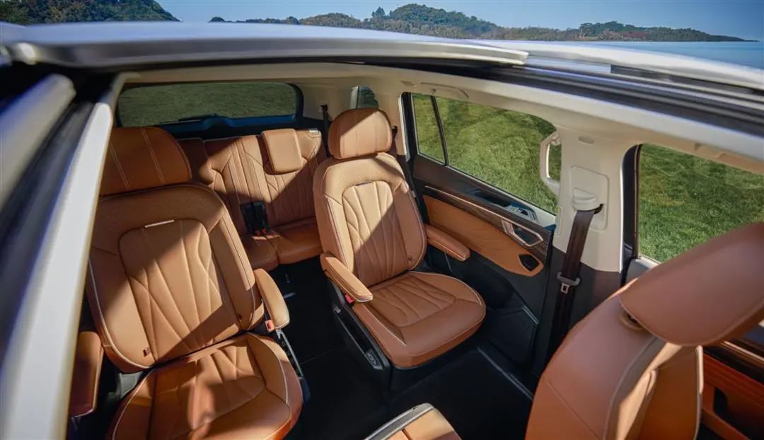 布局方面,新款揽境提供6/7座两种布局,6座版本中间是两个独立座椅,具备多模式气动按摩功能。中间过道达到了230mm,进出第三排还是挺方便的。7座版本格局多变,通过二、三排座椅的随需放倒,可拓展出进深超过2.2 m的“纯平”空间,轻松容纳婴儿车、露营装备等大件物品。