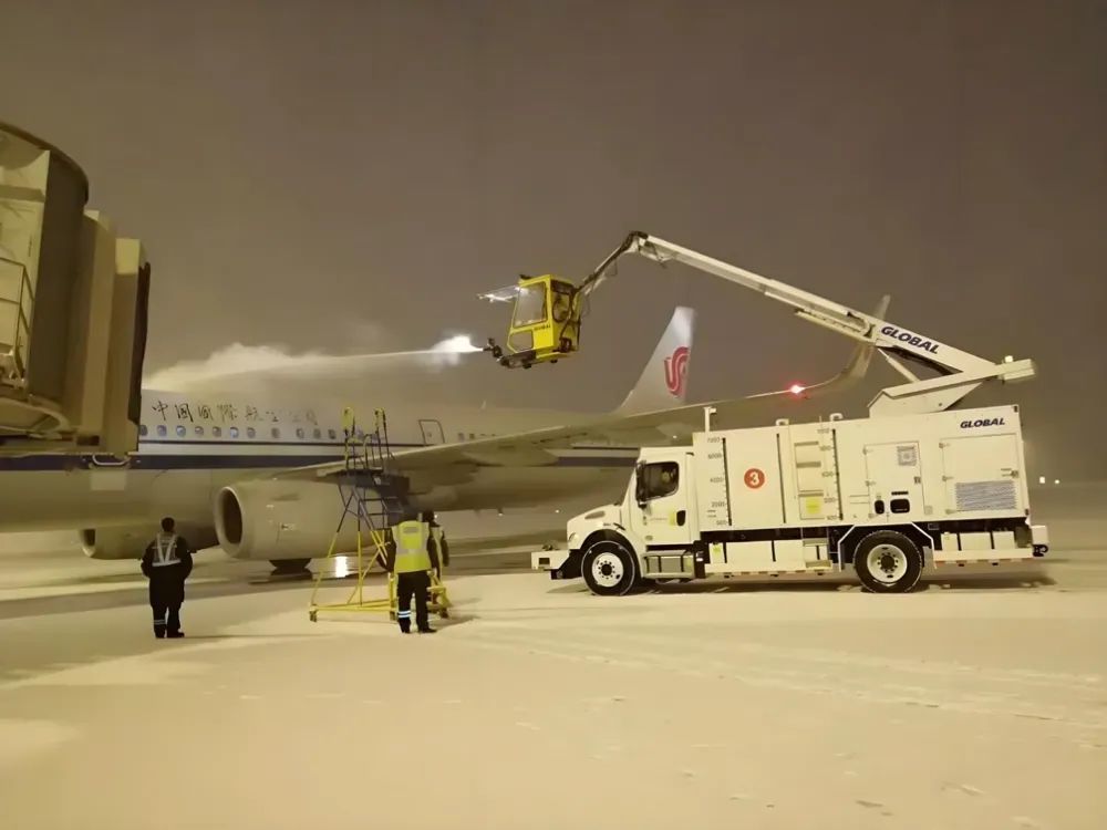 其中,除冰车有两种,一种是给跑道/路面除冰,一种是给机身除冰。后者能喷洒热除冰液,迅速融化飞机表面冰霜。