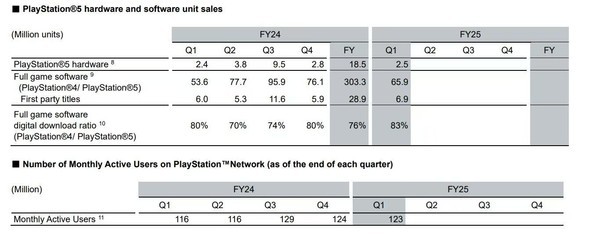在游戏软件方面,本季度PS平台全游戏销量达6590万套,较去年同期增加1230万套。其中第一方作品销量为690万套,同比增长90万套。数字版游戏下载占比进一步提升至83%,同比增加3个百分点。此外,PlayStation Network(PSN)月活跃用户数达1.23亿,虽较上季度末的1.29亿峰值略有回落,但同比仍增长700万,反映出索尼在用户留存与在线服务体验上的优化成果。