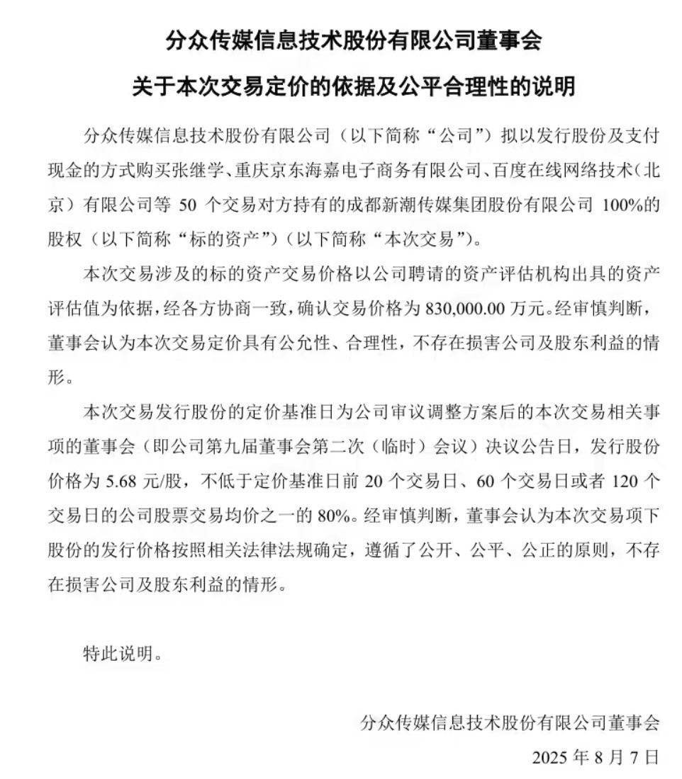 【环球网科技综合报道】8月6日晚间,分众传媒发布公告称,公司拟以发行股份及支付现金的方式,收购张继学、重庆京东、百度在线等50个交易对方持有的新潮传媒100%股权,交易价格为83亿元。交易完成后,新潮传媒将成为分众传媒的全资子公司。