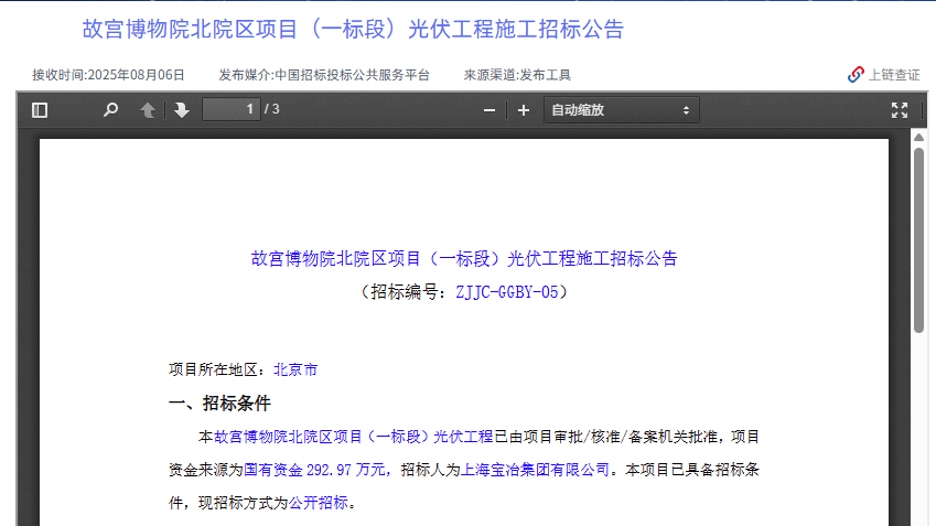 红星资本局8月8日消息,近日,中国招标投标公共服务平台上披露了一份《故宫博物院北院区项目光伏工程施工招标公告》,招标人为上海宝冶集团有限公司(下称“宝冶集团”)。