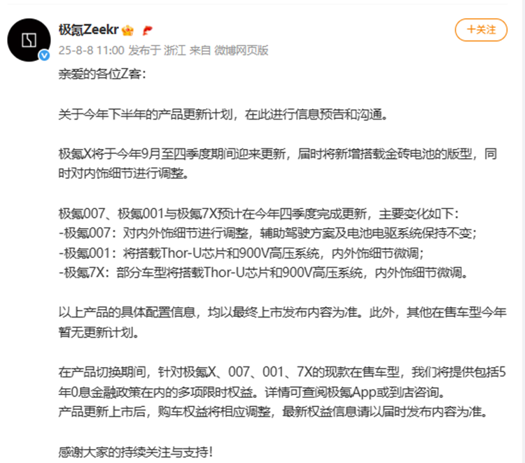 极氪001、极氪007和极氪7X将在四季度完成更新,极氪001和极氪7X变化较大,将会搭载英伟达Thor-U辅助驾驶芯片和900V高压系统。极氪007仅针对内外细节进行调整。
