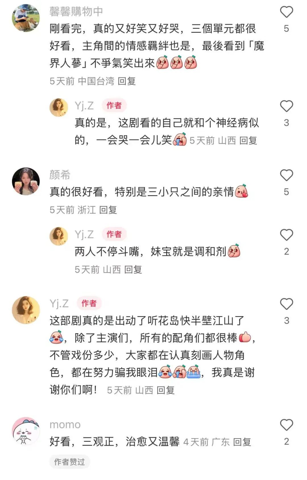 这部剧通过更加大众真实的情愫增强观众与剧情的链接。当你看到某个故事时,会想起自己的亲人,那便是这部剧所想要做到的温暖。