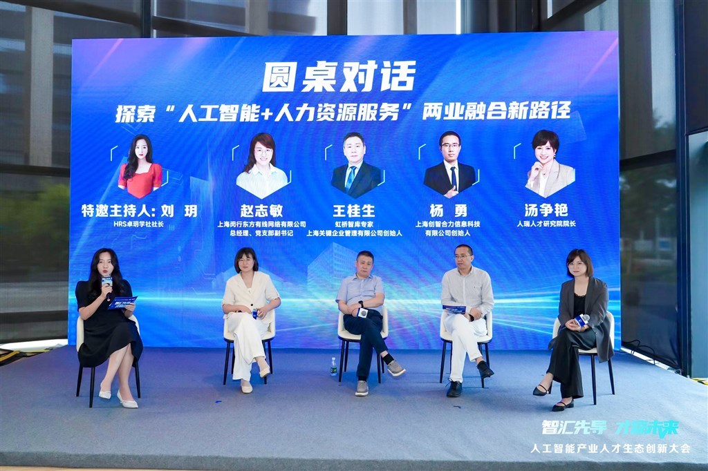 在圆桌交流对话环节,以“探索‘人工智能+人力资源服务’两业融合新路径”为主题,人工智能行业的甲方机构代表上海创智合力信息科技有限公司创始人杨勇,以及上海闵行东方有线网络有限公司总经理、党支部副书记赵志敏,人力资源服务机构代表人瑞人才研究院院长汤争艳,以及虹桥智库专家、上海关键企业管理有限公司创始人王桂生,一同围绕人工智能产业迅猛发展带来的深刻变革及产业人力资源服务相关需求展开深入探讨,提出要打造人工智能产业“引才-育才-留才”生态闭环,为上海提升核心竞争力构筑坚实人才基础。