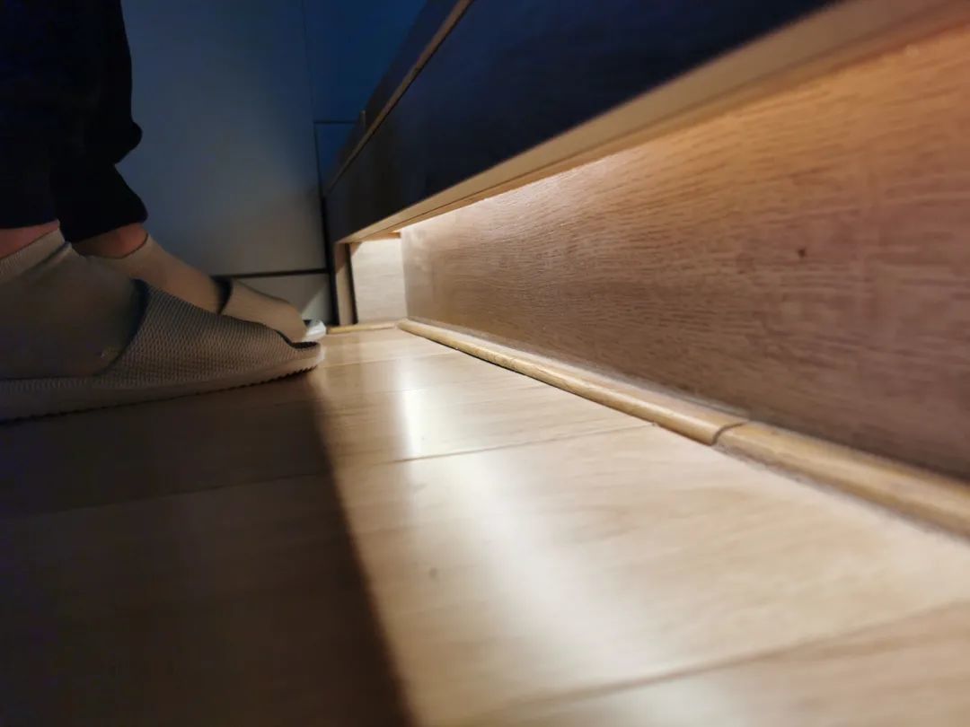 无主灯设计中,会在柜体层板、地台等位置装灯带的,这个位置的灯带安装,需要注意光源与地面/柜台的关系,比如灯带直对地面/台面,而地面/台面又是反光强烈的瓷砖或玻璃材质,就会形成刺眼的反光了。
