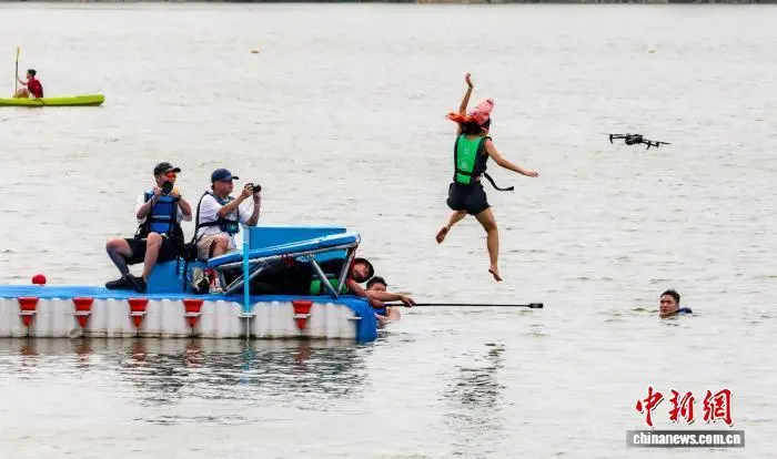 8月9日,在湖北武汉东湖风景区磨山楚城,一年一度的“跳东湖”活动热闹上演。“老武汉人渡长江,年轻的武汉人跳东湖”,依水而生的武汉人用自己的方式把水玩出了花样。图为青年人以各种姿势跳进东湖享清凉。中新社记者 张畅 摄