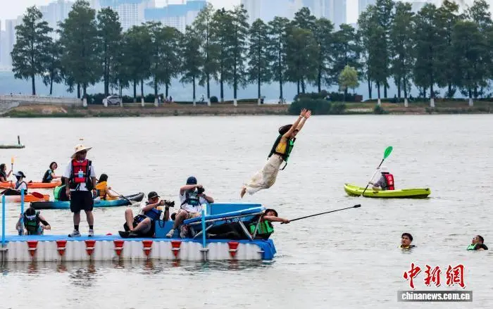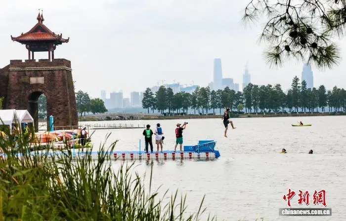 8月9日,在湖北武汉东湖风景区磨山楚城,一年一度的“跳东湖”活动热闹上演。中新社记者 张畅 摄
