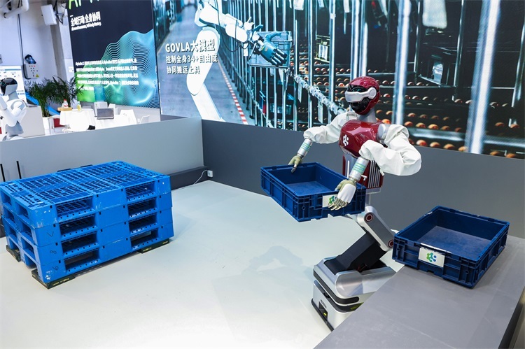 只见爱宝精准抓取箱体,将其码放在指定位置,用时不到60秒。而且最精彩的是,当箱子的位置故意被打乱时,爱宝依然稳稳对齐,完成任务。它不是靠“死记硬背”去搬运,而是靠对空间状态的实时理解做出反应,真正实现从“固定工位”向“全域行动”的跨越。