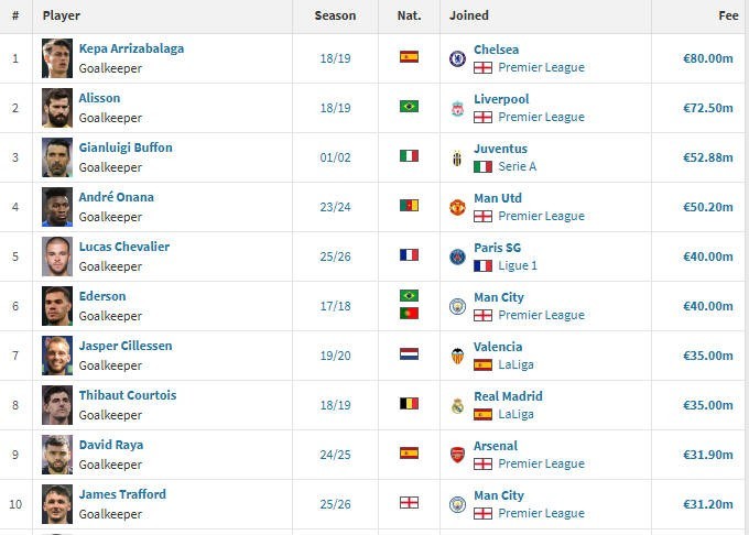 根据德国转会市场的统计数据,舍瓦利耶是足坛历史转会费(仅计算固定转会费)第5高的门将。