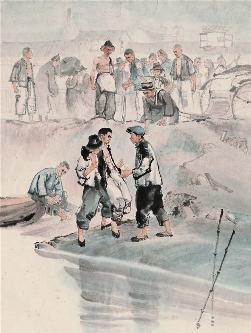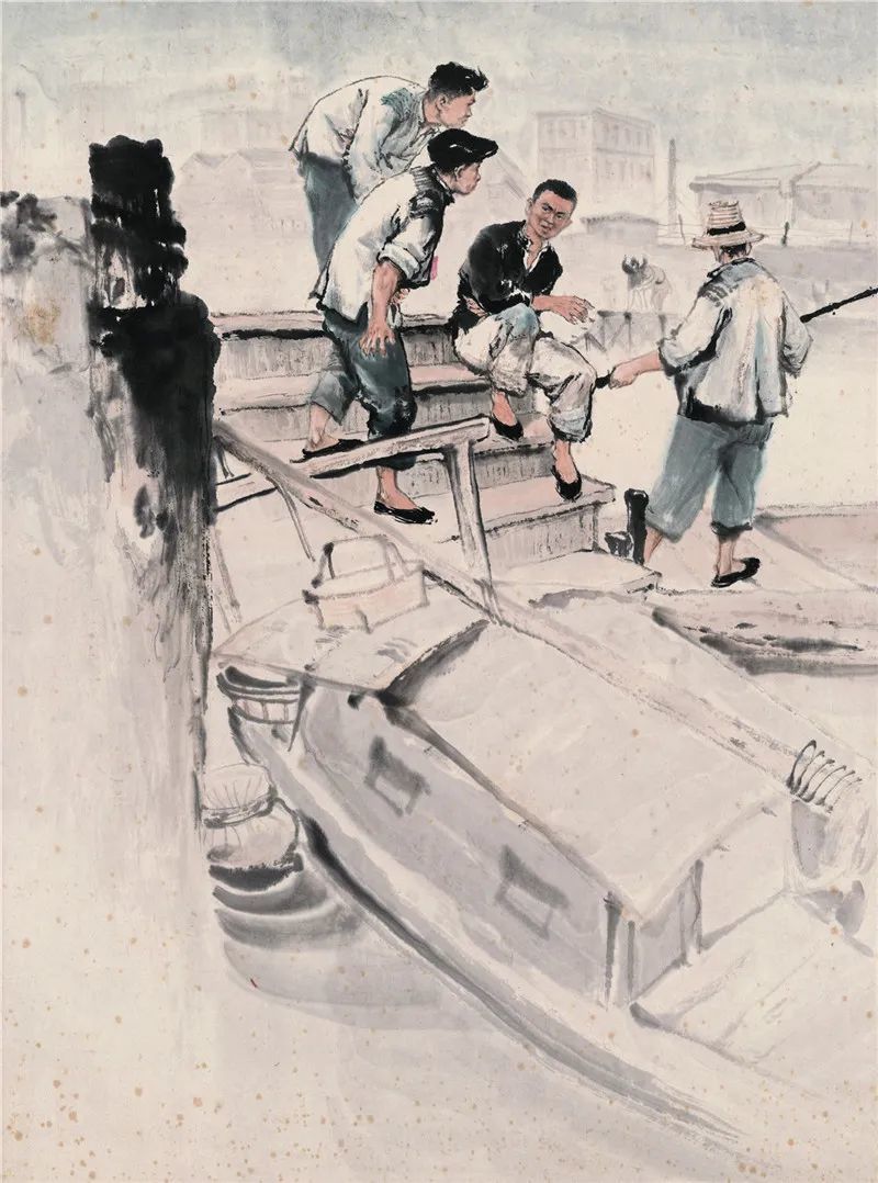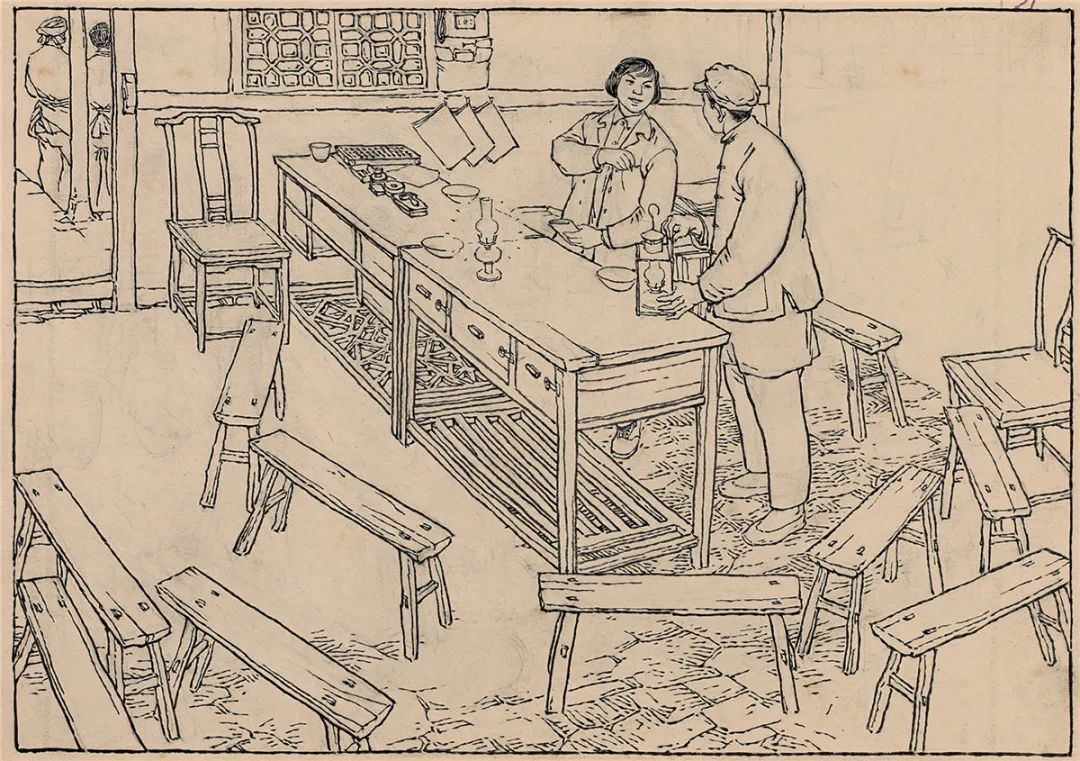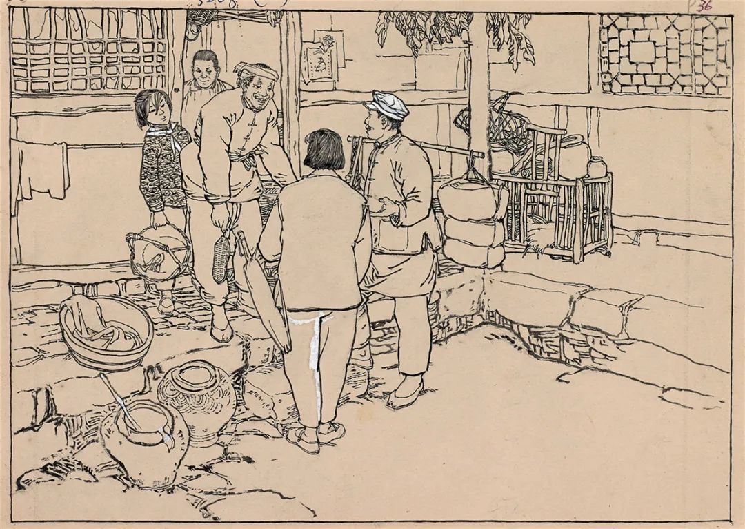 于是贺友直再到湖南去体验生活,回来又画了一遍,还是不行。为此,他非常苦闷。后来他感到老是自己关起门来苦思冥想行不通,于是他看了些中国传统绘画,如《清明上河图》《明刊名山图》《水浒叶子》等。贺友直发现《清明上河图》的视平线在画的外面,是俯视的,看见的东西多,适合于线描表现。而贺友直原来用的视平线很低,是仰视的,前面一个大人一挡,后面就没有东西了。从陈老莲的画中,贺友直又学习到了衣纹处理,试着用白描的方法画了几张,终于找到了感觉。