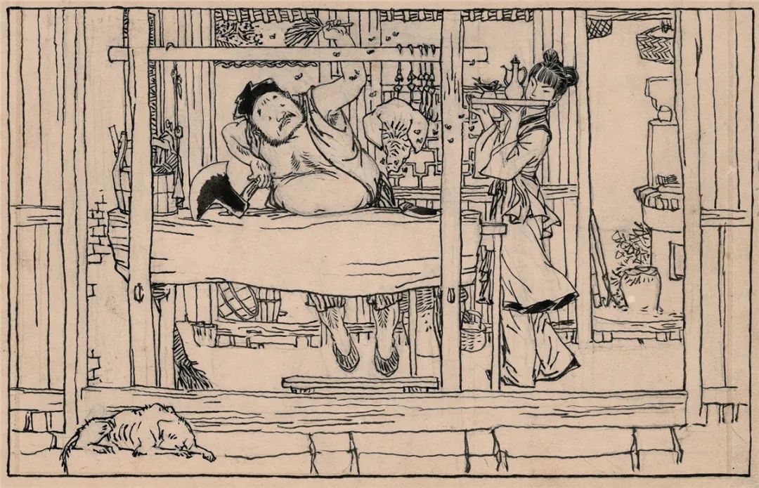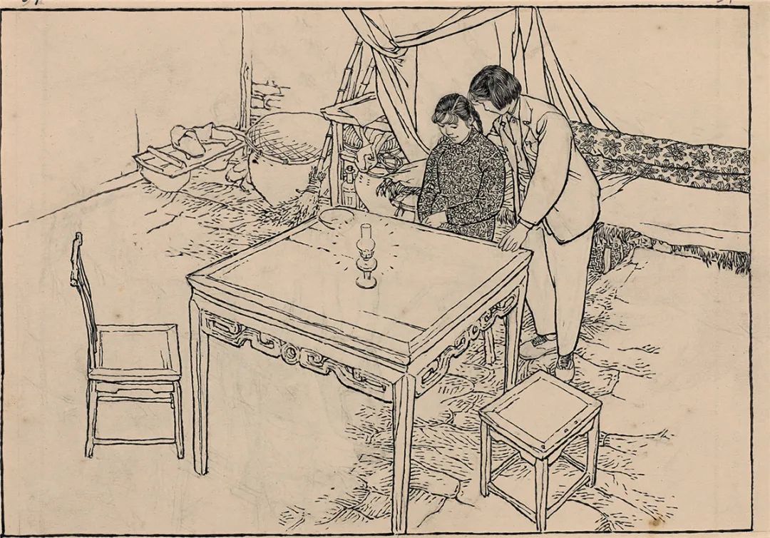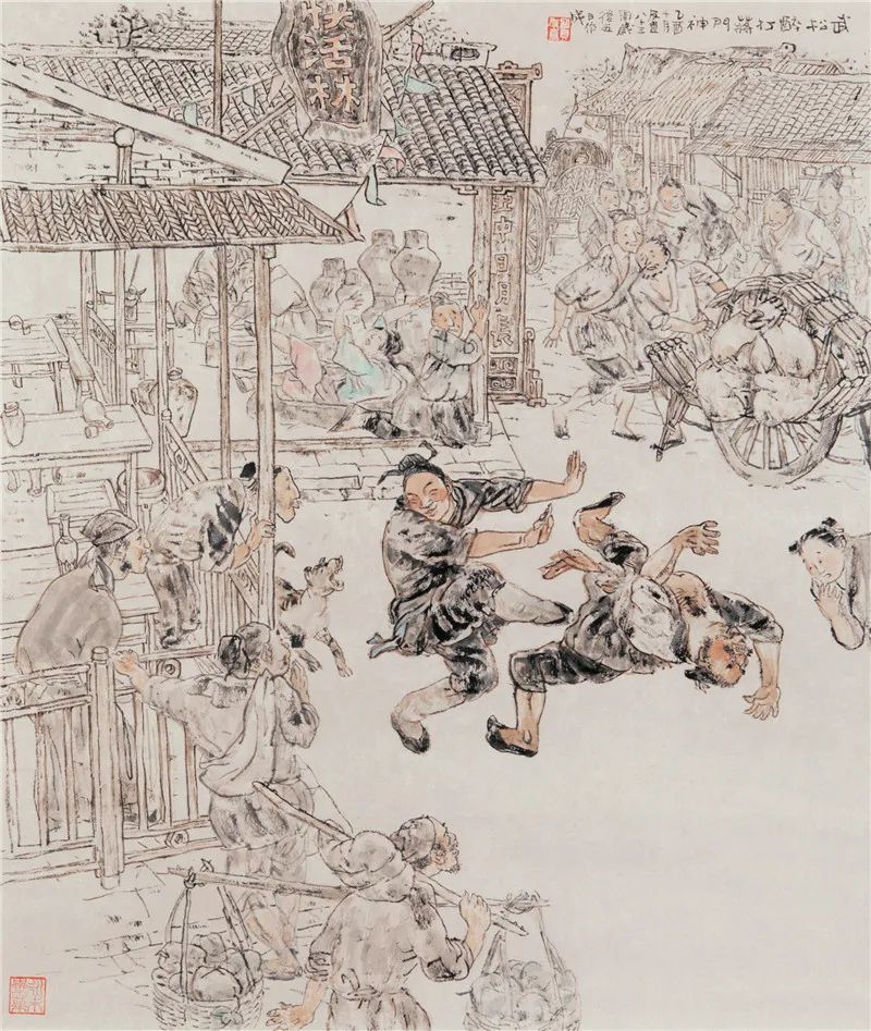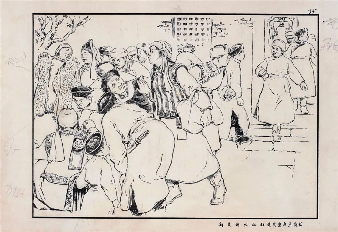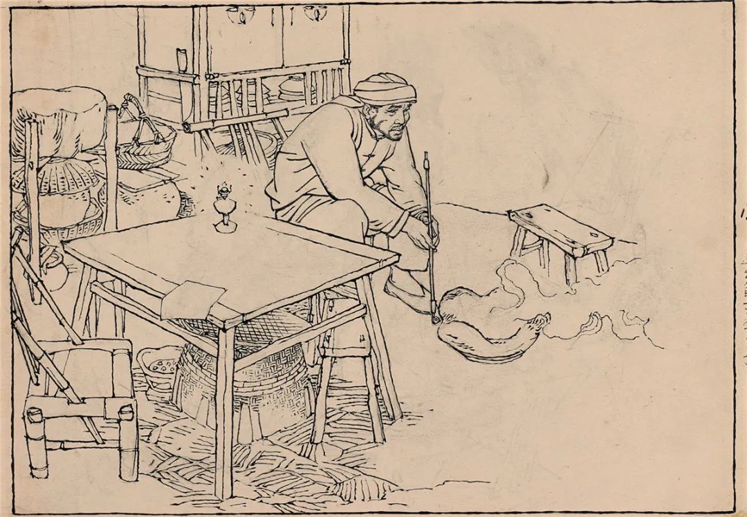 于是贺友直再到湖南去体验生活,回来又画了一遍,还是不行。为此,他非常苦闷。后来他感到老是自己关起门来苦思冥想行不通,于是他看了些中国传统绘画,如《清明上河图》《明刊名山图》《水浒叶子》等。贺友直发现《清明上河图》的视平线在画的外面,是俯视的,看见的东西多,适合于线描表现。而贺友直原来用的视平线很低,是仰视的,前面一个大人一挡,后面就没有东西了。从陈老莲的画中,贺友直又学习到了衣纹处理,试着用白描的方法画了几张,终于找到了感觉。