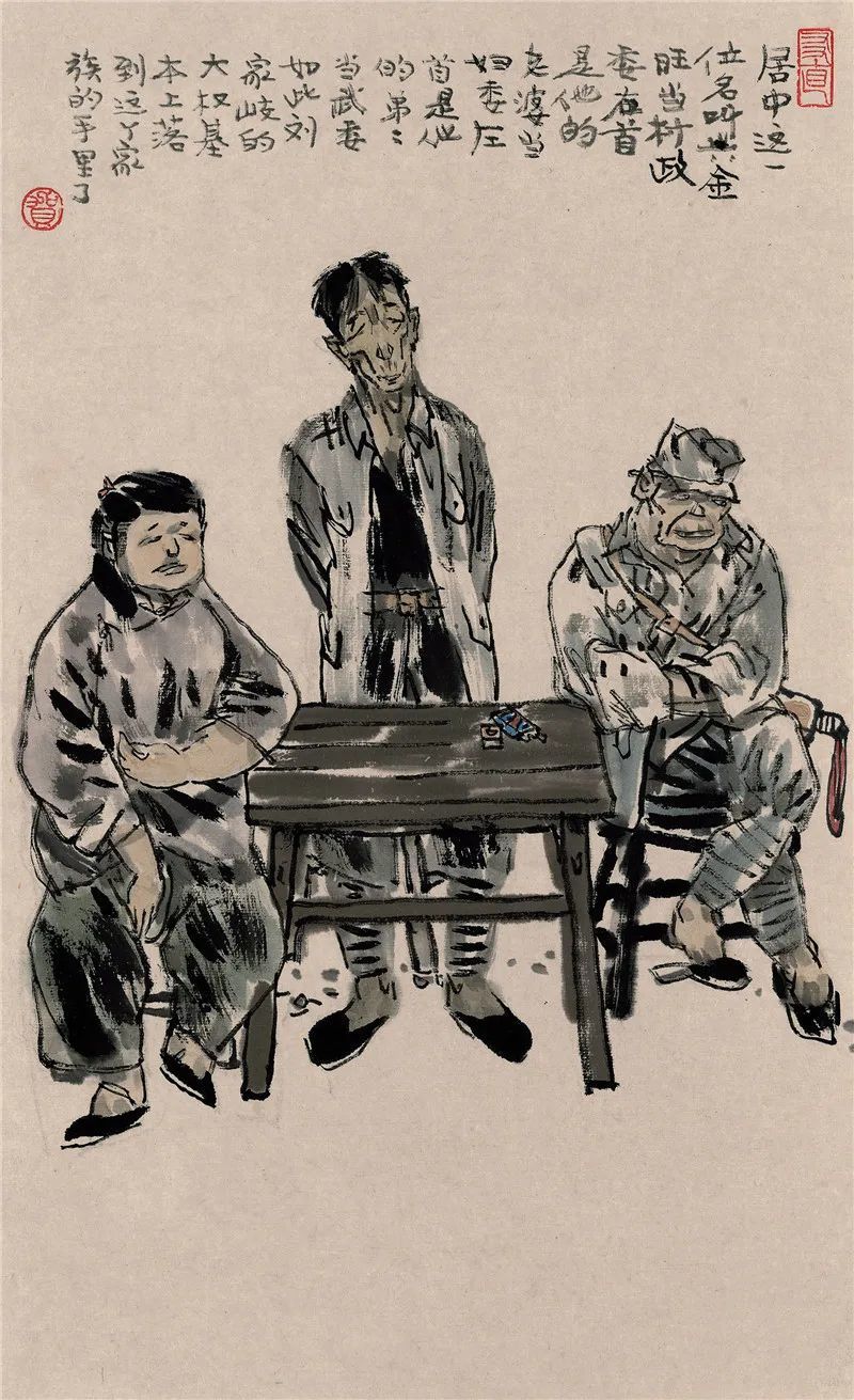 也就在这一时期,贺友直开始更自觉地探索创作规律。从题材内容的选择到表现方法的运用,他都力求减少盲目性,尽可能使艰苦的创作劳动取得预期的效果,即想的点子巧,刻画人物妙,环境配得好。他逐渐认识到,作为画故事的画家,必须学会“做戏”。所谓做戏,就是胸怀故事全局,挖掘人物内在的性格冲突,选取和捕捉生活中富有表现力的可视形象, 既富有情趣,又真实可信。打开长达三百九十六幅的《山乡巨变》,那些生活在富有浓郁的地方特色的湖南山乡的人们,在农业合作化运动中的一言一行、一举一动,被描绘得妙趣横生,真切自然。这一切说明,画家从生活出发来“做戏”的创作方法是正确而高明的。