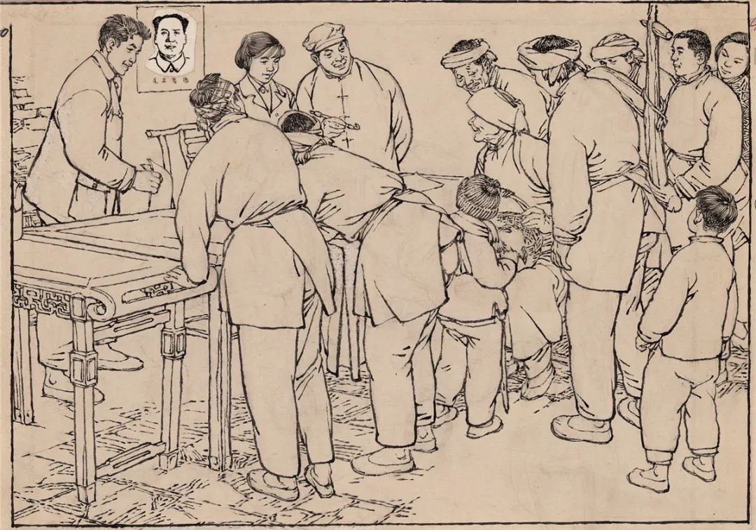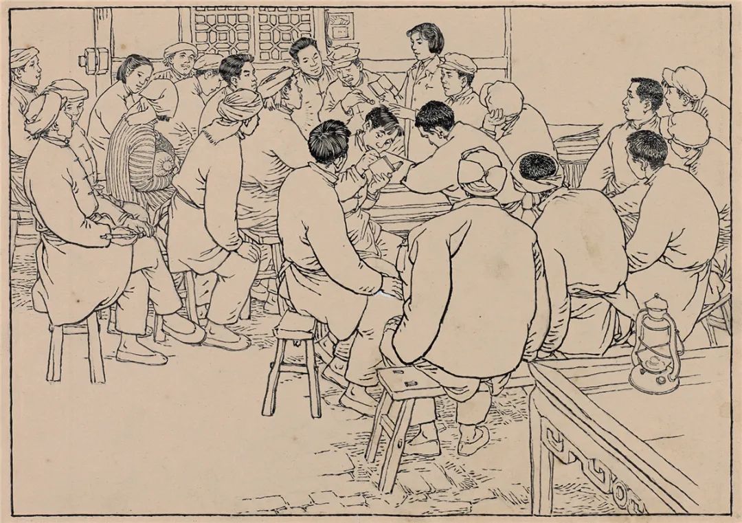 连环画对表达方式具有特别大的包容量,其说白了就是通过连延不断的画面来“讲故事”。在贺友直一系列的作品当中,长篇连环画《山乡巨变》无疑是最具代表性和影响力的。这部作品以周立波的长篇同名小说为脚本创作而成,小说描述了一九五六年中国农村合作化时期湖南省一个僻静的山乡, 人们在合作化的浪潮中所经历的思想变化。在合作化的冲击下,父子、夫妻之间,乃至每个人心灵内部的各种矛盾都浮现出来,而不法分子的破坏又增加了矛盾冲突的尖锐性和复杂性。在团县委副书记、共产党员邓秀梅的领导下,经过激烈的斗争, 使经济基础、社会习俗、家庭生活、爱情观念,以及人和人的关系都起了变化,整个山乡出现了新的面貌。虽然在今天看来,合作化运动不免有些急躁, 像政治运动更多于像土地变革,但身在其中的农民无疑是经历了一场波澜壮阔的社会变革。