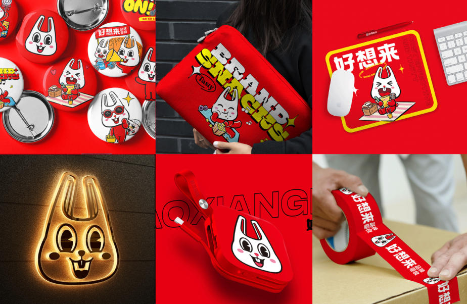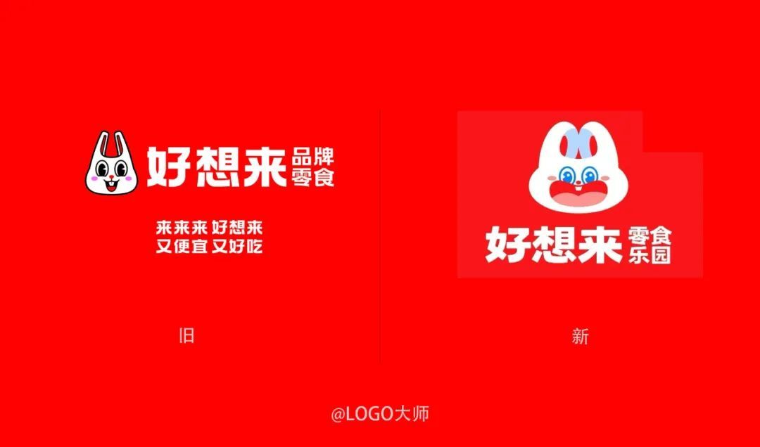 字体方面,新LOGO品牌名称“好想来零食乐园”相对占比较小,突出大笑兔子的形象设计,而且,字体横向拉伸变扁,字间距变小,体现更圆润亲切的品牌形象。