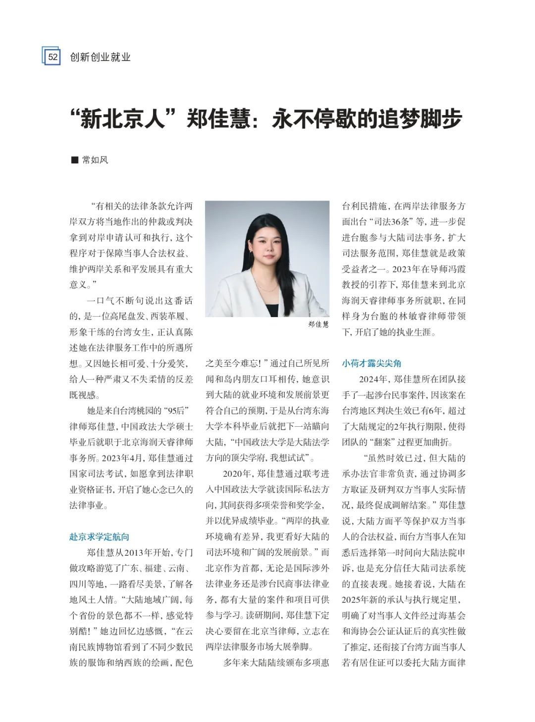 多年来大陆陆续颁布多项惠台利民措施,在两岸法律服务方面出台“司法36条”等,进一步促进台胞参与大陆司法事务,扩大司法服务范围,郑佳慧就是政策受益者之一。2023年在导师冯霞教授的引荐下,郑佳慧来到北京海润天睿律师事务所就职,在同样身为台胞的林敏睿律师带领下,开启了她的执业生涯。