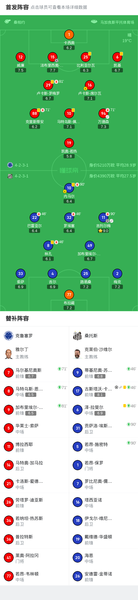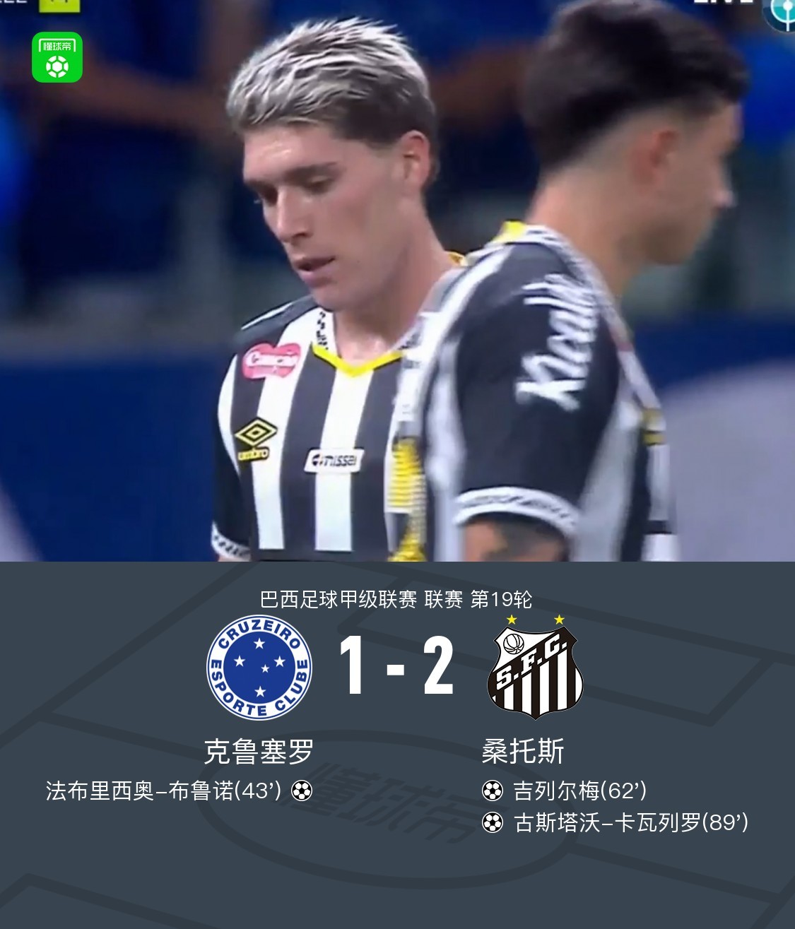 北京时间8月11日巴西足球甲级联赛 联赛 第19轮,克鲁塞罗主场对阵桑托斯。克鲁塞罗法布里西奥-布鲁诺破门。桑托斯吉列尔梅破门,古斯塔沃-卡瓦列罗破门。最终比分克鲁塞罗 1-2 桑托斯。