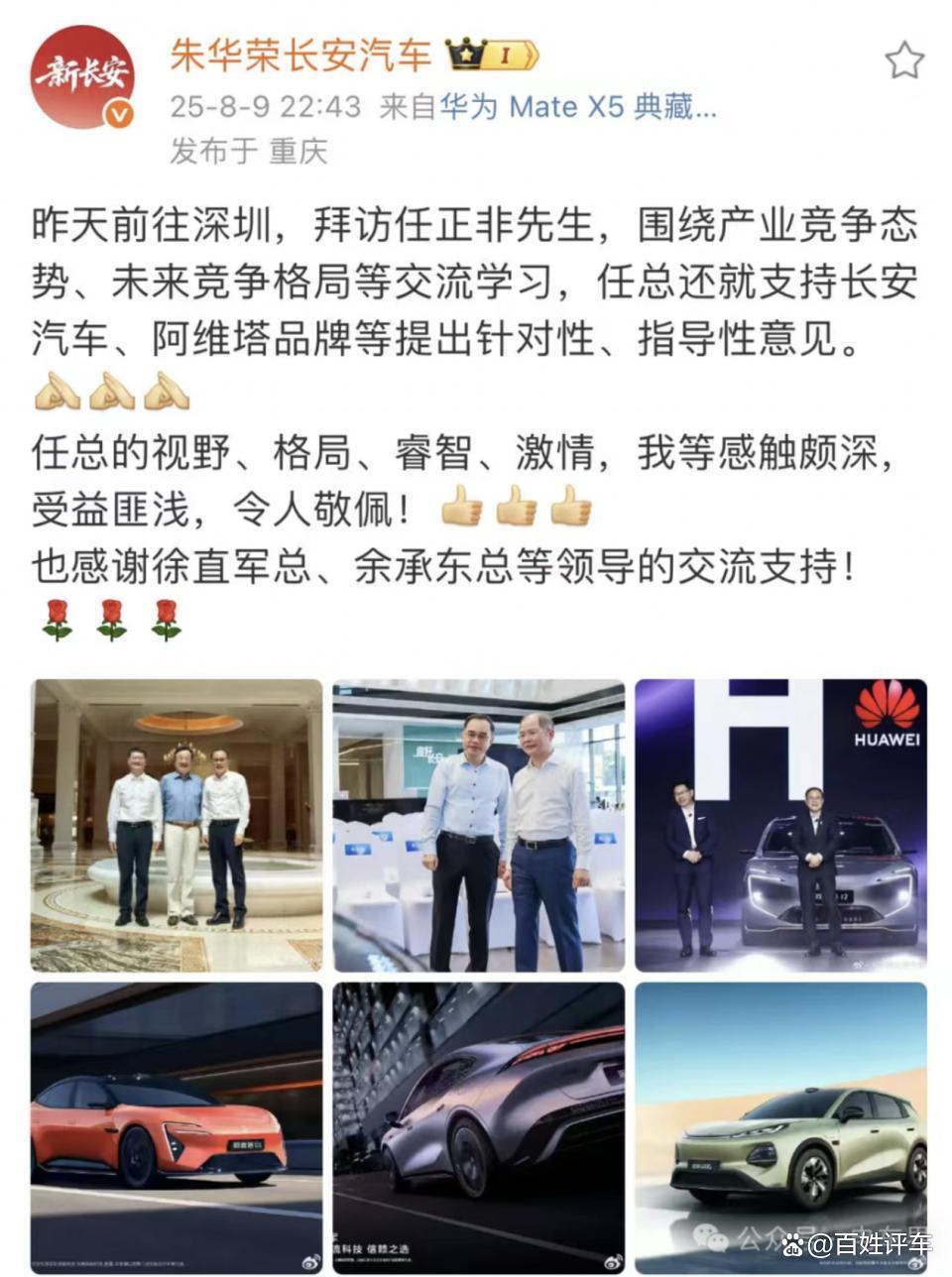 这次会面时间点颇为微妙——中国长安汽车集团作为国家推动央企改革、优化国有资本布局的重要举措,刚刚于2025年7月29日在重庆挂牌成立,成为继中国一汽集团、东风汽车集团之后的又一家汽车行业央企。朱华荣在会面后通过微博发文,称此次交流围绕"产业竞争态势、未来竞争格局"展开,任正非就支持长安汽车及旗下高端智能电动车品牌阿维塔提出了"针对性、指导性意见"。