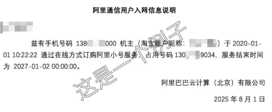根据阿里通信官方客户的说明,这个证明会盖章,这个证明也不是想开就能开,得需要提供机主身份证号码后 4 位,官方核实后发放。