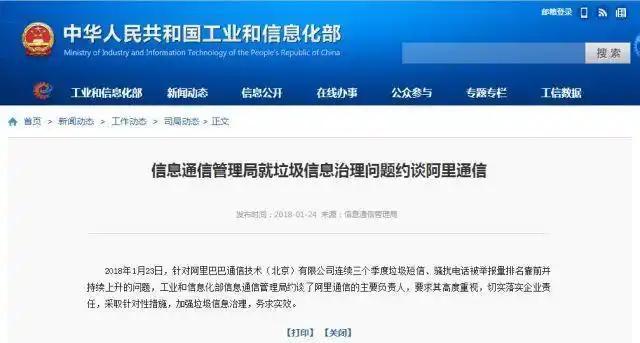 2018 年,阿里通信因为连续三个季度垃圾短信、骚扰电话被举报量排名靠前并持续上升,被工信部约谈。