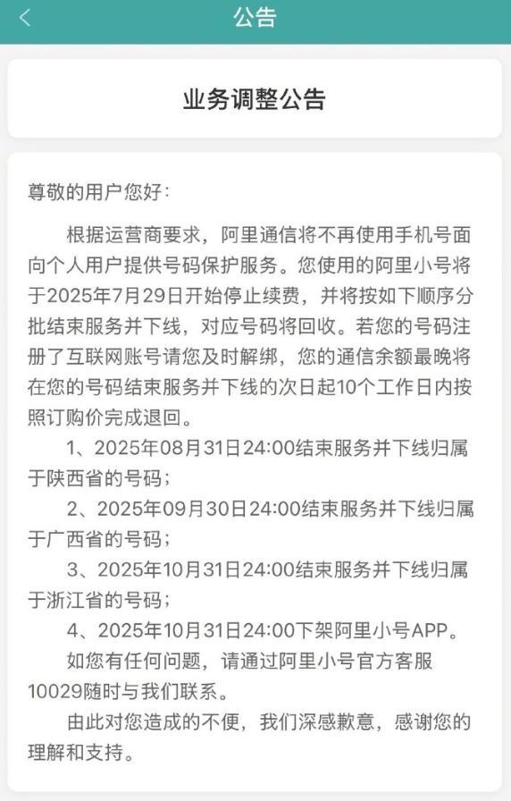 按顺序分批结束服务,原有号码回收,余额按订购价格退回,今年 10 月 31 号 APP 下线。
