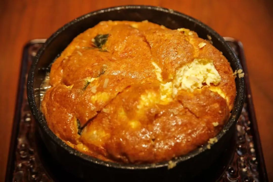 这道菜并不复杂,一个铸铁的容器,蛋液里加入虾仁等食材,连烧带烤,要涨起,所以这道菜以前也叫“涨蛋”。
