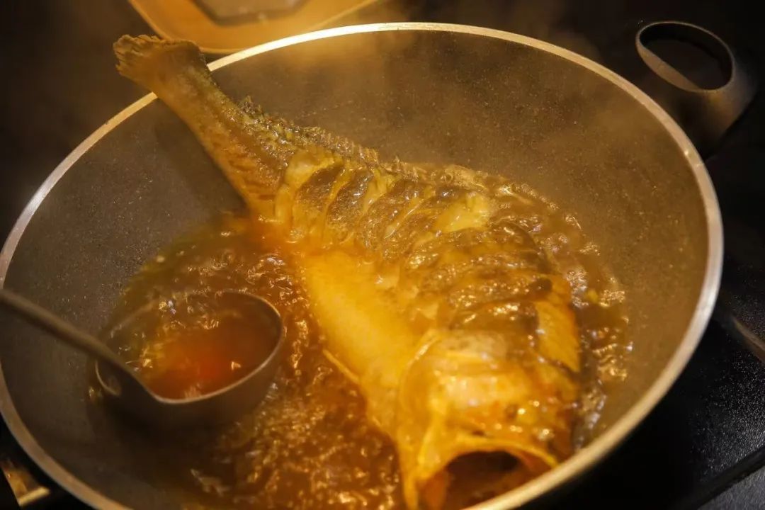 他是个产品主义者,每天都在研究产品,更多的时间是和团队做菜品研发。在这一餐晚宴上,阿庄换上厨师服,给大家亲自做了一道菜:糖醋软溜黄鱼焙面。