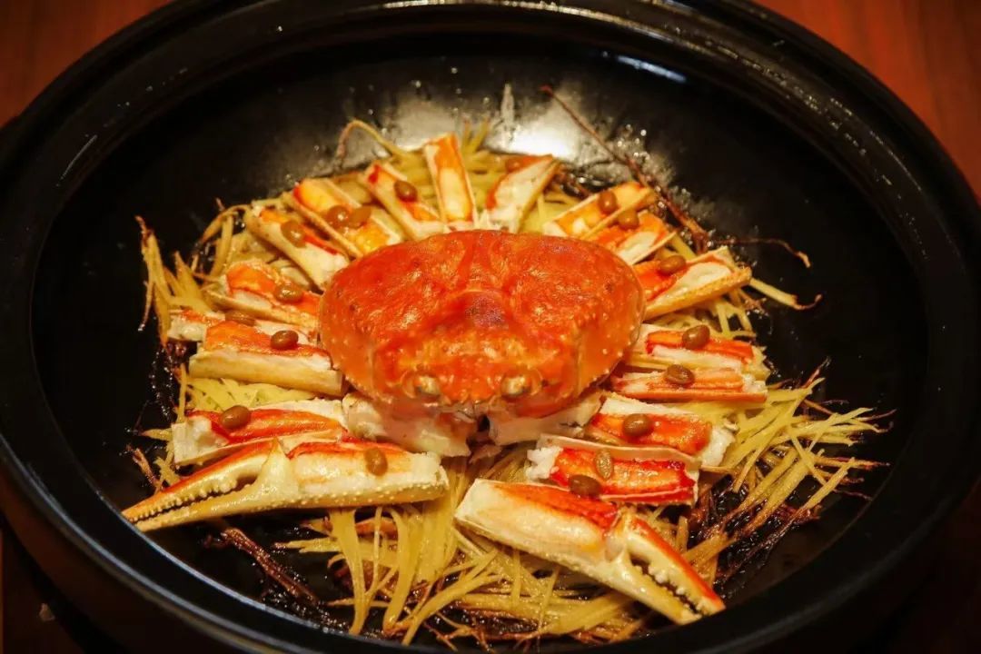 也吃了河南菜的创新,比如用西瓜酱焗一只松叶蟹,西瓜酱的鲜勾引着蟹的鲜,相得益彰;也有汴京烤鸭,即便叫汴京烤鸭,其实也是脱胎于北京烤鸭,创新在于现场烤制的烧饼,以及本地的咸菜丝,混合上酥脆的鸭皮,竟然有一种土洋土洋的混搭感;荆芥拌油条,本来就很完美了,荆芥作为很出圈的河南香料,加上黄瓜与炸酥的老油条,混合在一起已经非常饱满了,阿庄又在其中加上几片伊比利亚火腿,更是神来之笔,把味觉的丰富度瞬间提升。