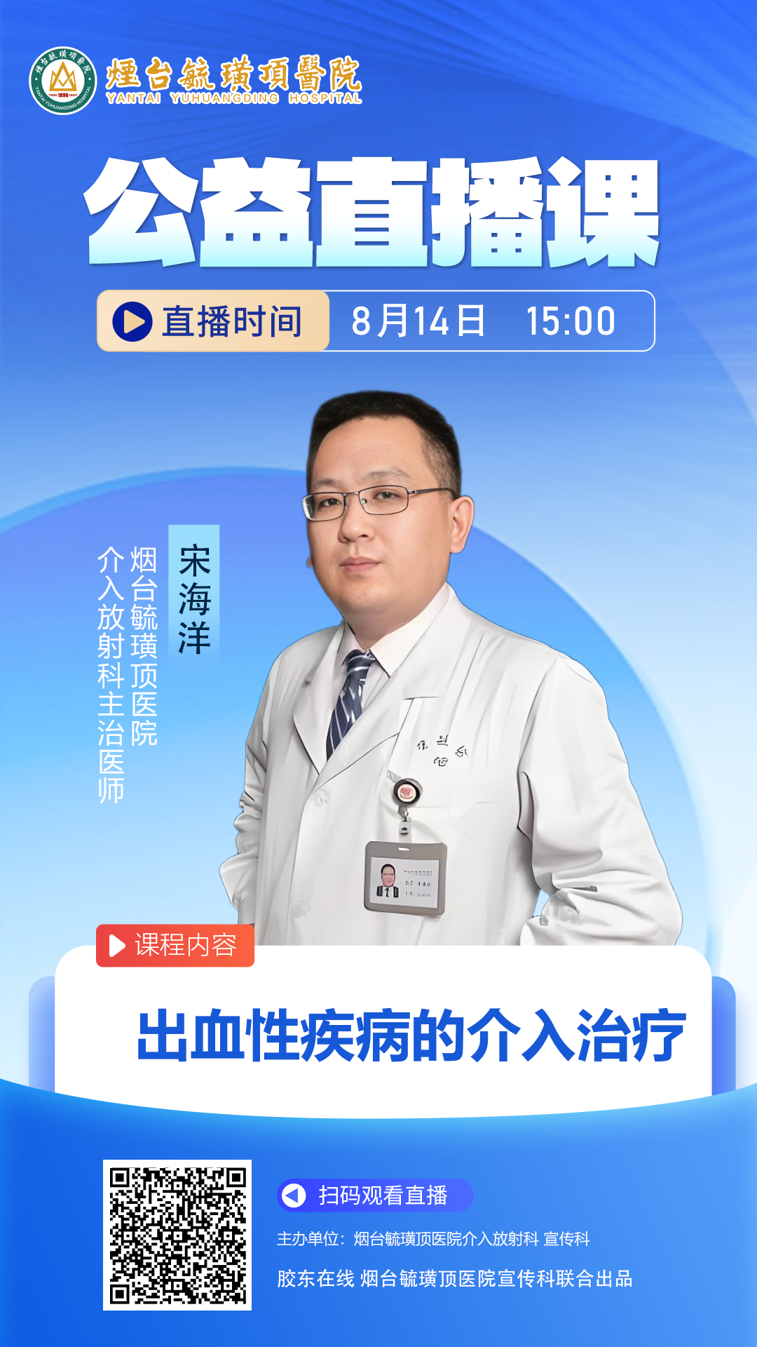 8月14日(周四)下午15:00,烟台毓璜顶医院介入放射科联合胶东在线网站,围绕“出血性疾病的介入治疗”主题开展健康科普直播。