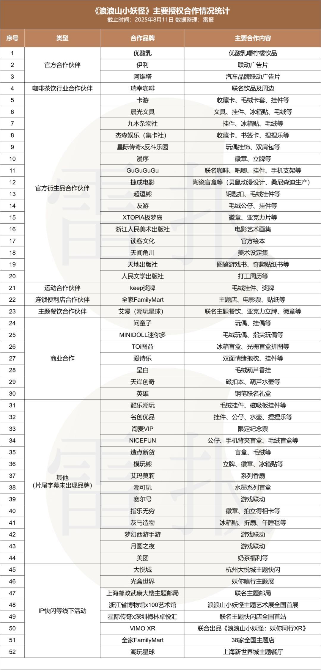 除此之外,根据电影最后透露的合作品牌名单以及公开网络资讯,雷报整理了目前为止《浪浪山小妖怪》授权合作名单如下(人工统计存在误差):