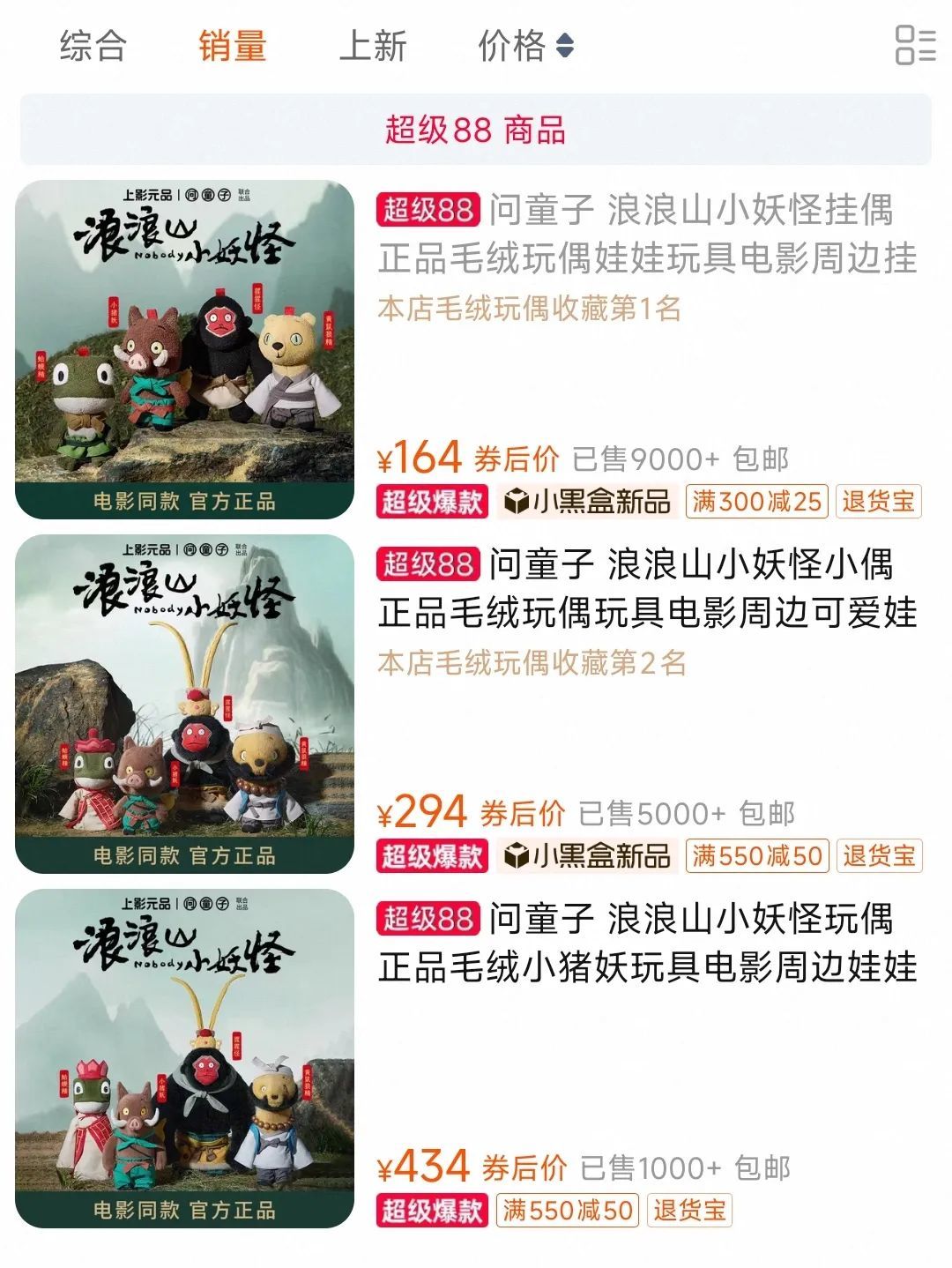 国产创意毛绒品牌问童子推出的浪浪山系列玩偶也表现不俗,其开发的浪浪山系列玩偶上线3天售出超万件。截至8月11日,雷报统计,其在抖音和天猫旗舰店双渠道3款不同规格的毛绒产品共计售3万+只。相较于其他品牌推出的同类型毛绒玩偶类定价集中在30元-99元,问童子玩偶的定价要高得多,12cm的挂偶定价在169元,40cm以上玩偶则超过400元。雷报粗略估算,相关玩偶的销售总额已超过600万元。